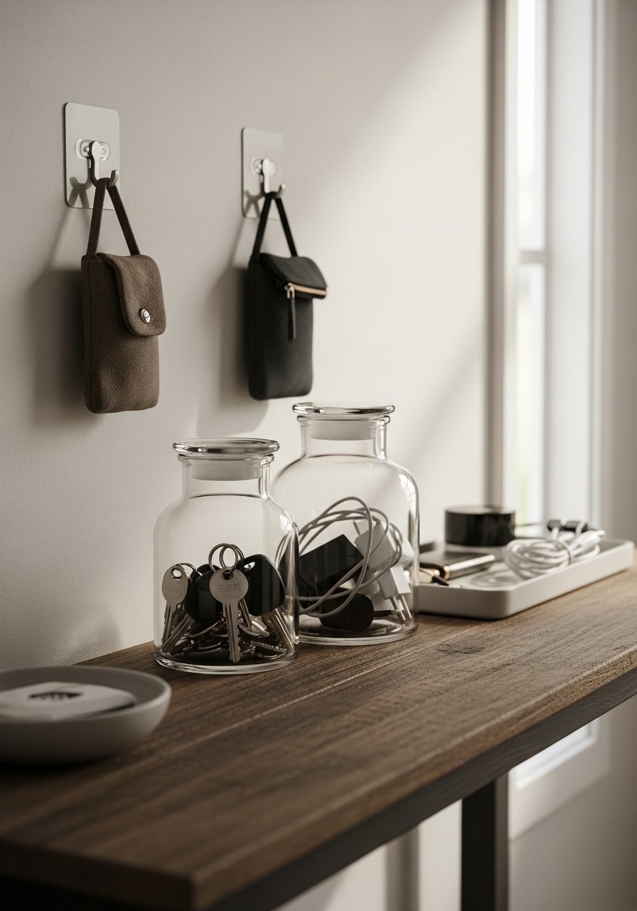 I put daily things where I’ll naturally reach for them. Glass jars for small items, a tray for mail, and hooks at eye level. The visual shift is practical and pleasing — useful items now look curated. People miss scale: tiny jars get lost unless paired with a tray or stack of books.