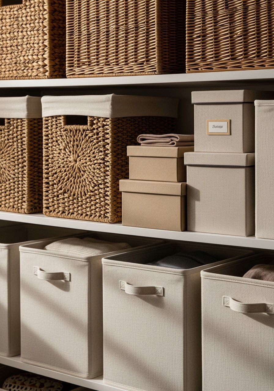 A common mistake is hiding everything behind matching lids. I leave one open basket to show function and keep it approachable.