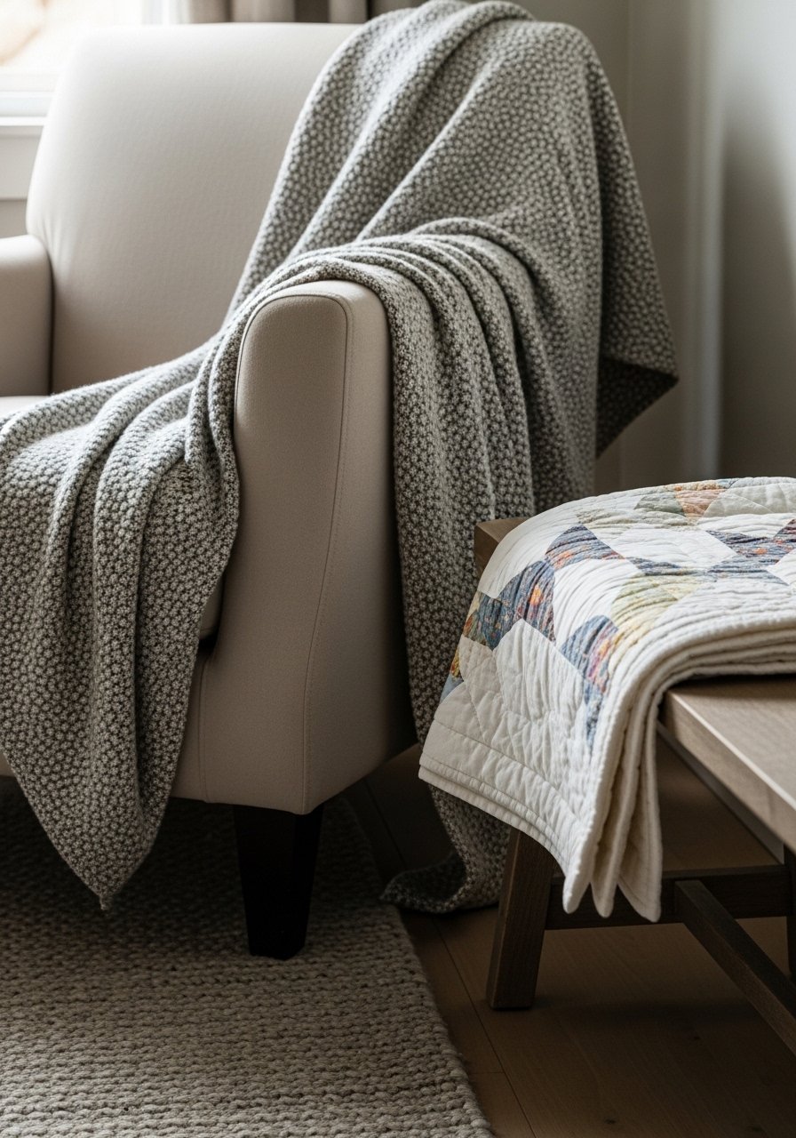 I always lay down the biggest, lowest pieces first. A throw, a folded quilt, or a small rug anchors the eye and keeps things from floating. The base sets the palette and the mood.