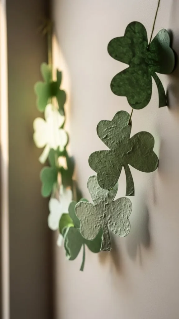 Cut shamrock shapes from green paper, recycled folders, or gift wrap. Perfection is not required. Small variations make it feel handmade. Thread them onto string or twine. Keep spacing relaxed instead of rigid.