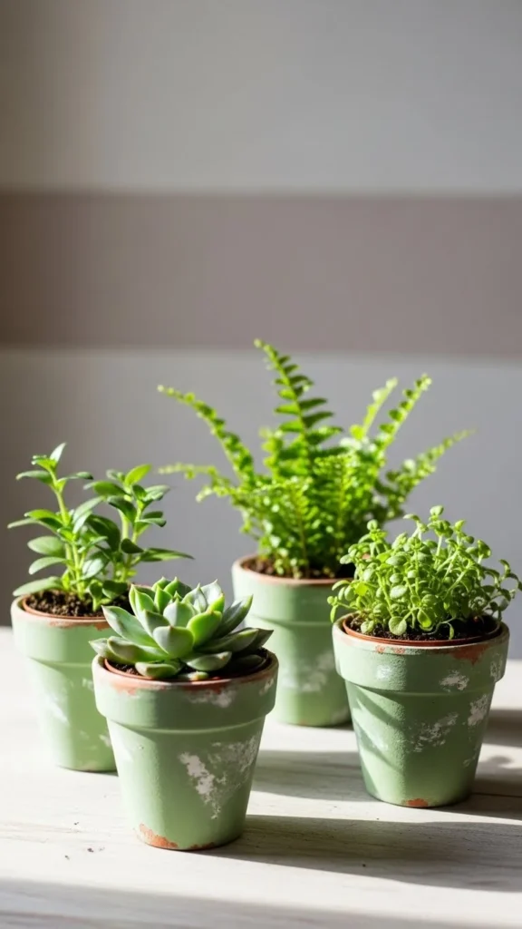 Paint small pots in muted green tones. Let brush marks show. That keeps it relaxed.
