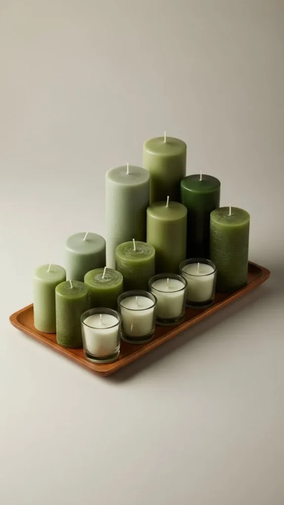 Use green candles in mixed heights. Place them on a tray or plate.